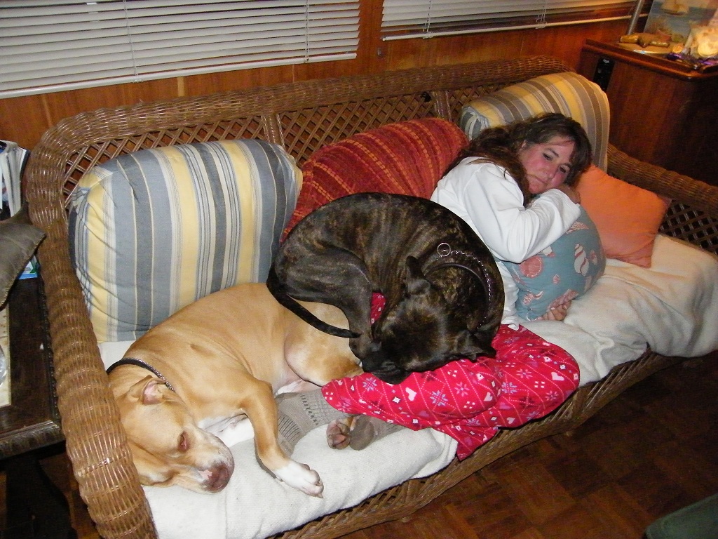 Everyone loves the couch. Pam was down with a bad cold and snuggled in. Chevy and Ruby also love the couch. Chevy picked the end opposite of Pam and there was no room left for Ruby... so we thought.