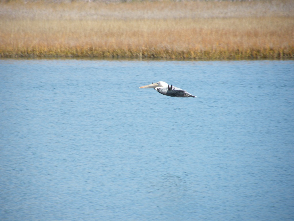 This was taken yesterday, somewhere between Swansboro and Wrightsville, North Carolina. Pelicans are ungainly looking birds, but amazingly graceful in flight.