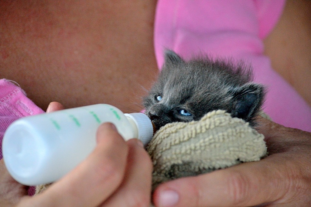 a three week old kitten. Someone brought it into the vet's office. She found it in the woods. Something chewed a hole in its belly and it was infested with maggots, which probably saved its life. Pam brought it home because it needs feeding every three hours or so. It's not a permanent member of the crew as it's going to Pam's mom's in July.