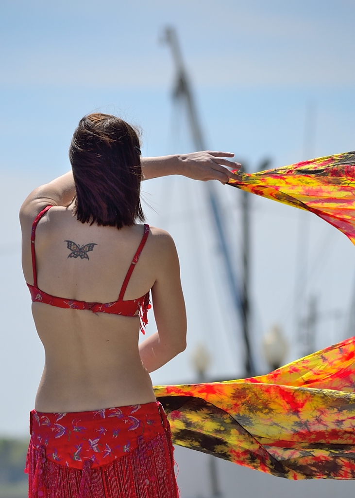 Last weekend was "Peaches to the Beaches", the world's longest garage sale, stretching for 200 miles along highway 341 here in Georgia. It ends in Brunswick's Mary Ross Park, next to our marina. Besides all the usual vendors selling garage sale stuff and the farmers' market people selling their wares, there was the Brunswick Belly Dancer.